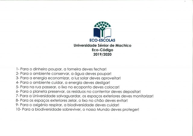 No âmbito do Programa Eco-Escolas 2019/2020, as oficinas de Pontos e Tricot elaboraram nos dias 15 e 17 de janeiro de 2020, frases para o Eco-Código da Universidade Sénior de Machico. As frases incidiram nos temas selecionados para o presente ano letivo: água, resíduos, energia, biodiversidade e espaços exteriores.